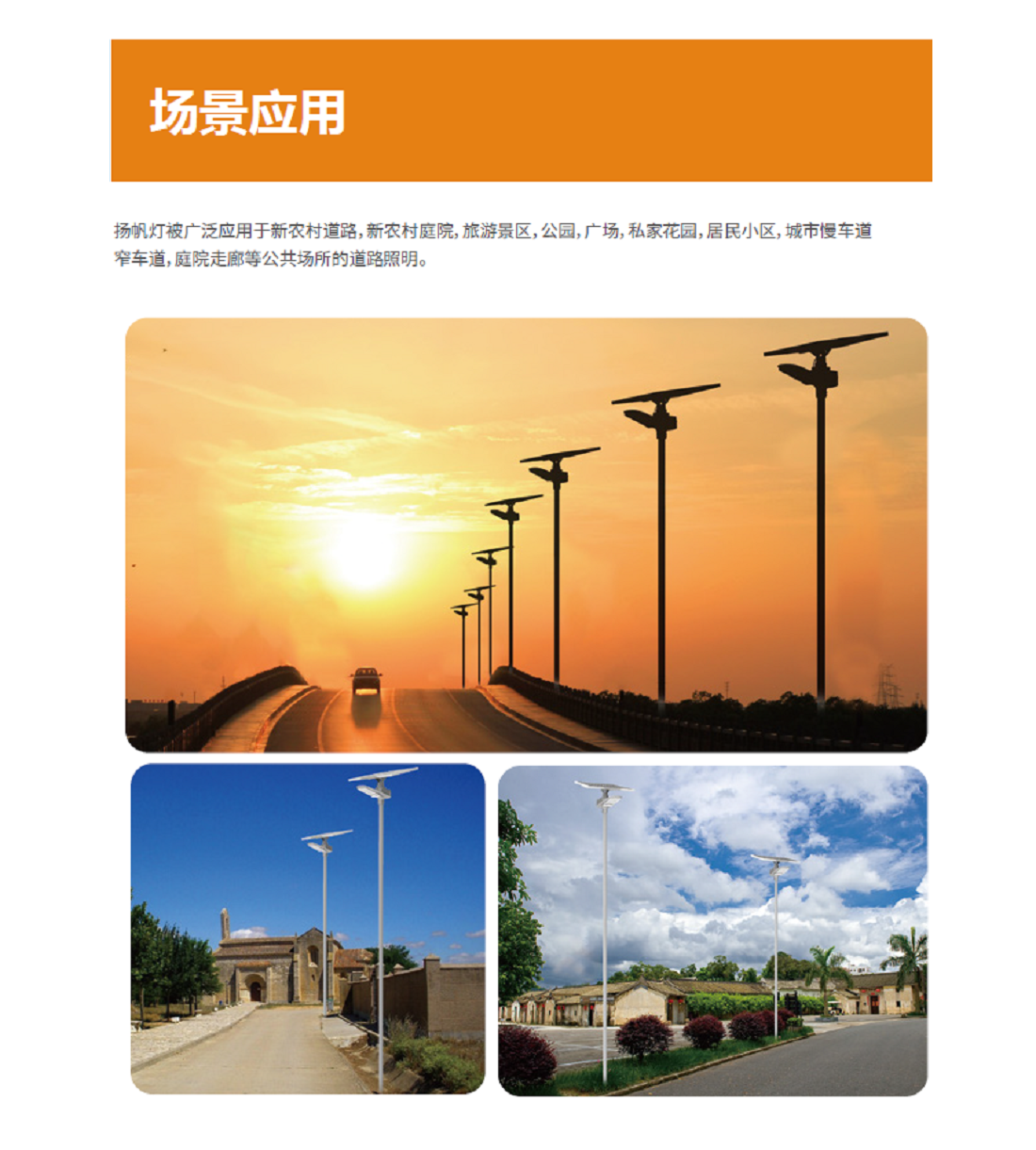 揚帆燈典范版作為揚帆燈的迭代新款,亮度和性價比均大幅提升,被廣泛應用于新農村道路、旅游景區、公園、廣場、居民小區、城市慢車道/窄車道等場景。